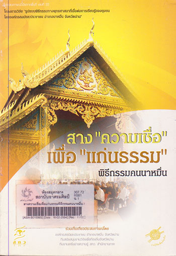 สางความเชื่อเพื่อแก่นธรรมพิธีกรรมคนนาหมื่น / ผู้ร้อยเรียงประสบการณ์ เกศสุดา สิทธิสันติกุล ; ผู้ร่วมร้อยเรียงประสบการณ์ พระปลัดอภินันท์อภิปุญโญ, เชติพนธ์ ตาน้อย, ฉัตรวดี นนทรี และ ทีมวิจัยโครงการรูปแบบพิธีกรรมทางพุทธศาสนาที่เอื้อต่อการเรียนรู้ของชุมชน โดยองค์กรสงฆ์และประชาชนอำเภอนาหมื่น จังหวัดน่าน