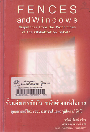 รั้วแห่งการกักกัน หน้าต่างแห่งโอกาส : ยุทธศาสตร์ใหม่ของประชาชนในสมรภูมิโลกาภิวัตน์ = Fences and windows : dispatches from the front lines of the globalization debate / นาโอมี ไคลน์ : เขียน ; พิภพ อุดมอิทธิพงศ์ : แปล ; ภัควดี วีระภาสพงษ์ : บรรณาธิการ