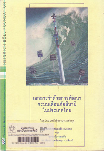 เอกสารว่าด้วยการพัฒนาระบบเตือนภัยสินามิในประเทศไทยในรูปแบบหนังสือรวบรวมข้อมูลพร้อมบทและสรุปข้อเสนอแนะจากชุมชนผู้ประสบภุย 30 เดือน ภายหลังเหตุการณ์สินามิ / คาร์ล เชกชไนเดอร์, ทิวาวรรณ ชัยขาว และ รอมลี แมเราะ ; ทีมงานโครงการสึนามิ เอดวอทช์.