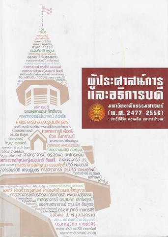Partial Contents: ศาสตราจารย์ ดร. ปรีดี พนมยงค์ ผู้ประศาสน์การมหาวิทยาลัยธรรมศาสตร์และการเมือง (2477-2495) -- จอมพล ป. พิบูลสงคราม (2495-2500) -- ศาสตราจารย์ หลวงจำรูญเนติศาสตร์ (2500-2503) -- จอมพลถนอม กิตติขจร (2503-2506) -- พลตรี พระเจ้าวรวงศ์เธอพระองค์เจ้าวรรณไวทยากร กรมหมื่นนราธิปพงศ์ประพันธ์ (2506-2514) -- สัญญา ธรรมศักดิ์ (2514-2517) -- ศาสตราจารย์ พันตรี ป๋วย อึ๊งภากรณ์ (2518-2519) -- ศาสตราจารย์ ดร. ปรีดี เกษมทรัพย์ (2519-2520) -- ศาสตราจารย์ประภาศน์ อวยชัย (2520-2525) -- ศาสตราจารย์ คุณหญิงนงเยาว์ ชัยเสรี (2525-2531) -- ศาสตราจารย์เกียรติคุณเกริกเกียรติ พิพัฒน์เสรีธรรม (2531-2534) -- ศาสตราจารย์นรนิติ เศรษฐบุตร (2534-2537, 2538-2541) -- ดร. ชาญวิทย์ เกษตรศิริ (2537-2538) -- รองศาสตราจารย์ ดร. นริศ ชัยสูตร (2541-2547) -- ศาสตราจารย์ ดร. สุรพล นิติไกรพจน์ (2547-2553) --ศาสตราจารย์ ดร. สมคิด เลิศไพฑูรย์ (2553-ปัจจุบัน) |